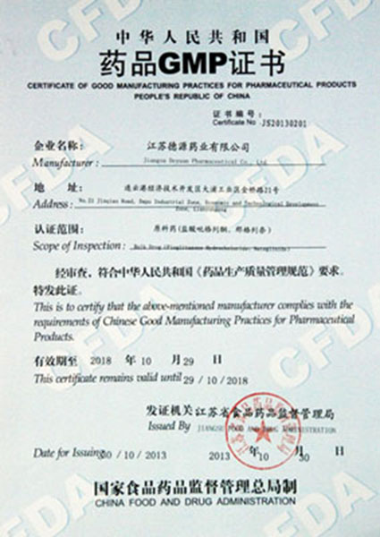 2013年10月14日,江蘇省藥品GMP公示(第97號(hào)),德源藥業(yè)原料藥(鹽酸吡格列酮、那格列奈)生產(chǎn)線符合《藥品生產(chǎn)質(zhì)量管理規(guī)范》,通過GMP認(rèn)證。德源藥業(yè)于11月4日收到江蘇食品藥品監(jiān)督管理局頒發(fā)的《藥品GMP證書》。
