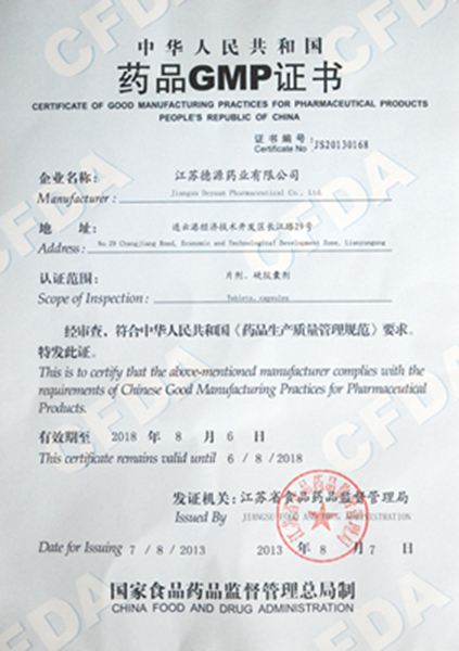 8月6日,接江蘇省食品藥品監(jiān)督管理局通知,經(jīng)現(xiàn)場檢查和審核批準(zhǔn),江蘇德源藥業(yè)有限公司固體制劑車間符合中華人民共和國《藥品生產(chǎn)質(zhì)量管理規(guī)范》(2010年修訂)要求,發(fā)給《藥品GMP證書》(證書編號:JS20130168)。