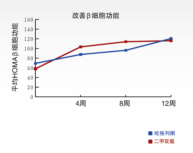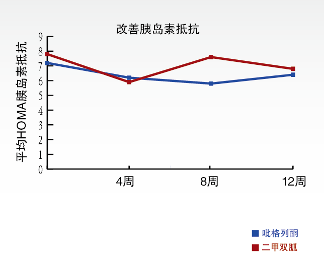鹽酸吡格列酮與二甲雙胍皆具改善胰島素抵抗的效果,但二者的作用機制不同,二者的作用部位也有差別。吡格列酮主要促進外周組織攝取葡萄糖,而二甲雙胍主要抑制肝糖輸出,故二者具有互補的降糖機制。“復(fù)瑞彤®”作用集中于代謝缺陷,改善了胰島素敏感性和β細(xì)胞功能。