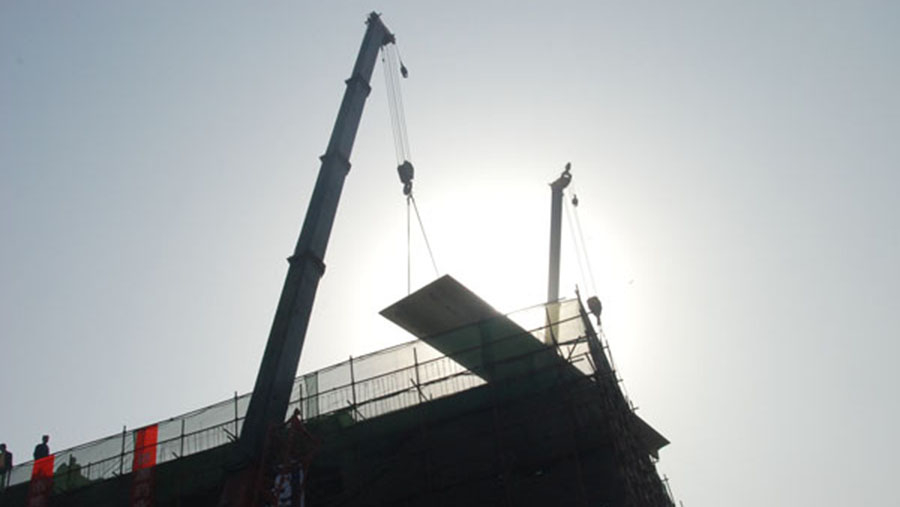 這是在安裝最后一塊水泥板,德源藥業(yè)原料藥車間全面封頂