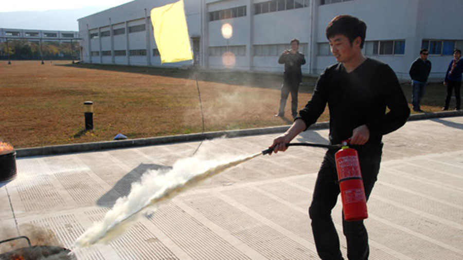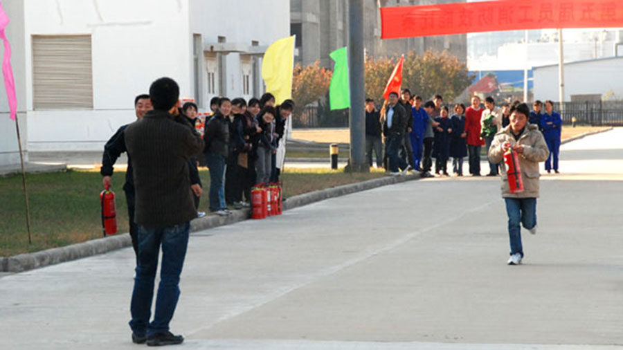 兩名員工手持消防器材,飛速地沖向火堆,用手里的滅火器對準(zhǔn)熊熊燃燒的火焰根部噴射,火舌頃刻間被斬斷——這是公司11月8日舉行的消防技能競賽中上演的精彩一幕。