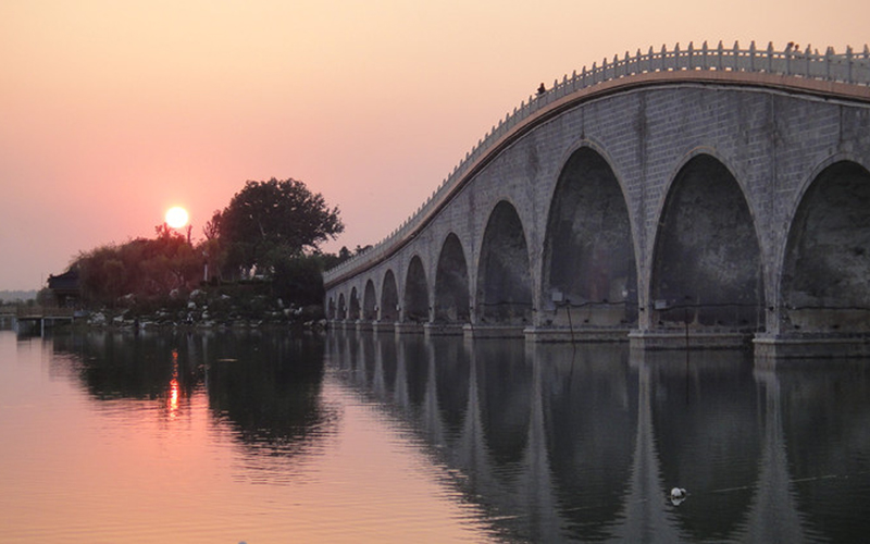 十七孔橋是景區(qū)的標志性建筑。橋兩側的護欄上,雕刻著一個個小獅子,像道彩虹一樣橫跨湖面。西雙湖湖面波光粼粼,視野開闊,這么大的湖面,這么優(yōu)質的水資源,現在真的很難得。小朋友們不禁想要捉魚,沒有工具,順手折一根蘆葦給孩子,逗逗年幼的孩子吧。