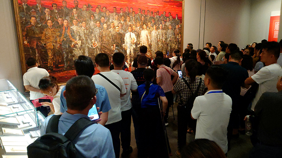 在一大紀念館里,鮮紅的黨旗下,莊嚴的宣誓墻前,德源全體黨員面向黨旗,重溫入黨誓詞。
