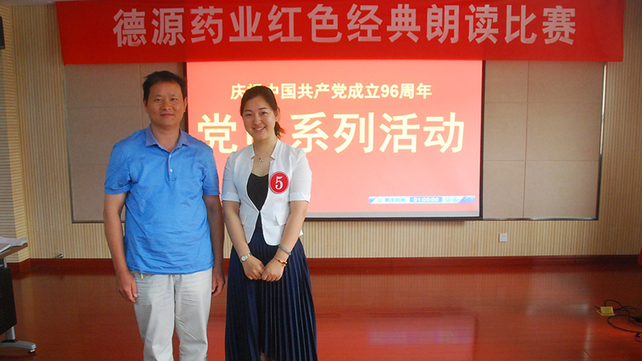 6月28日下午,“德源藥業(yè)紅色經典朗讀比賽”在公司會議室成功舉行。來自固體制劑車間、質量部、制造部、研究所、市場部、業(yè)務部等部門共計33名選手參加比賽。比賽邀請市委宣傳部孫宜志處長、恒瑞醫(yī)藥工會主席趙霞、中金瑪泰工會主席笪瑩、公司黨委副書記徐金官、公司人力資源行政總監(jiān)薛四明擔任評委。