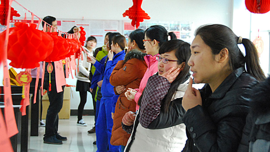 為了營(yíng)造中國(guó)元霄佳節(jié)的傳統(tǒng)氛圍,活動(dòng)還特別安排了猜燈謎。燈謎涉及面廣泛,有字謎,成語(yǔ)迷,地名迷,實(shí)物迷等。女工們開(kāi)動(dòng)腦筋,思維靈活,有人猜中了好幾條,拿到了好幾樣獎(jiǎng)品,顯露出一副開(kāi)心的笑臉。