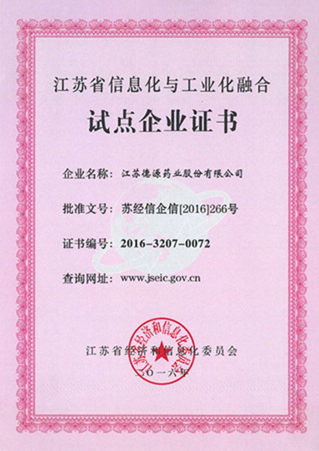 為加快全省企業(yè)信息化工作步伐,推進(jìn)信息化與工業(yè)化深入融合,進(jìn)一步促進(jìn)創(chuàng)新型企業(yè)建設(shè),強(qiáng)化信息技術(shù)應(yīng)用,鼓勵(lì)企業(yè)開展生產(chǎn)性信息服務(wù),江蘇省經(jīng)濟(jì)和信息化委員會(huì)組織開展了2016年江蘇省企業(yè)信息化試點(diǎn)、先進(jìn)、示范企業(yè)申報(bào)工作。按照相關(guān)工作程序和評(píng)審辦法,經(jīng)企業(yè)申報(bào)、市經(jīng)信委初審、省專家組評(píng)審,江蘇省經(jīng)濟(jì)和信息化委員會(huì)最終認(rèn)定,江蘇德源藥業(yè)股份有限公司入選江蘇省兩化融合試點(diǎn)企業(yè)名單。