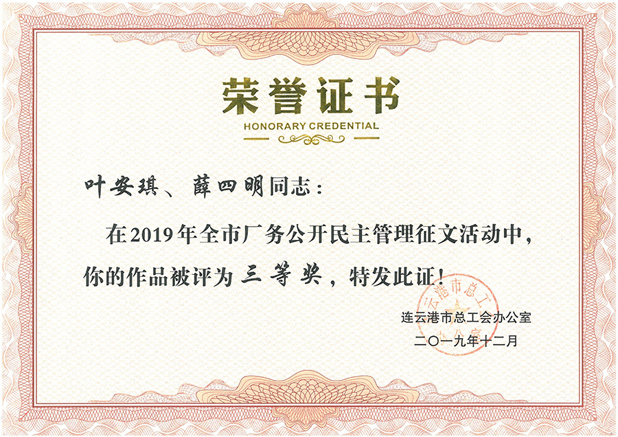 近日,市總工會為在2019年全市廠務(wù)公開民主管理征文活動中的獲獎作品頒發(fā)證書,我公司葉安琪、薛四明以公司開展廠務(wù)公開民主管理工作為實例撰寫的《民主管理是凝聚職工構(gòu)建和諧企業(yè)的重要途徑》被評為三等獎。