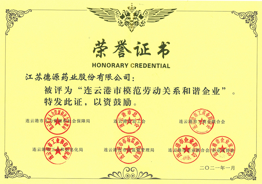 長期以來,德源藥業(yè)認(rèn)真貫徹落實黨和政府關(guān)于構(gòu)建和諧勞動關(guān)系的決策部署,以促進(jìn)企業(yè)發(fā)展、維護(hù)職工權(quán)益為原則,以勞動關(guān)系長期和諧穩(wěn)定為目標(biāo),深入開展和諧勞動關(guān)系創(chuàng)建活動,有力促進(jìn)了勞動關(guān)系雙方互信合作,企業(yè)與職工實現(xiàn)了同發(fā)展、共成長,形成了規(guī)范有序、公正合理、互利共贏、和諧穩(wěn)定的勞動關(guān)系新局面。公司自2013年獲得市模范勞動關(guān)系和諧企業(yè),2014年獲得省模范勞動關(guān)系和諧企業(yè)以來,連年獲此殊榮。