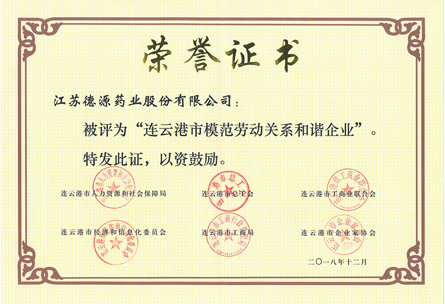 長期以來,德源藥業(yè)堅持以勞動關系長期和諧穩(wěn)定為目標,誠實守信,依法經(jīng)營,深入開展和諧勞動關系創(chuàng)建活動,切實維護職工的合法權益,實現(xiàn)了企業(yè)與職工的共同發(fā)展與成長,獲得了上級主管部門的多次表彰。自2012年我市開展這項活動,公司已連續(xù)7年獲得此項榮譽,并已于2014年獲得省模范勞動關系和諧企業(yè)榮譽稱號。