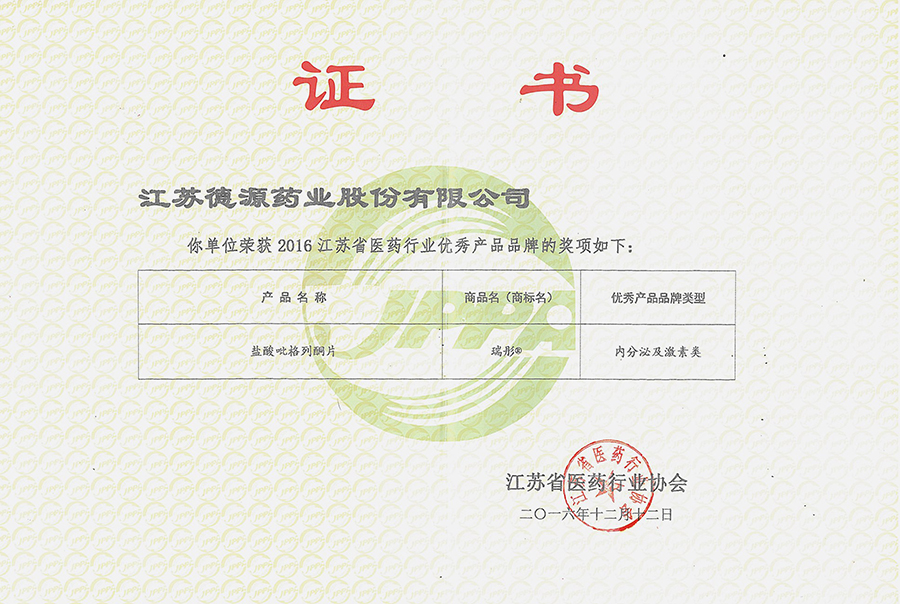 近日,省醫(yī)藥行業(yè)協(xié)會(huì)二屆五次理事(擴(kuò)大)會(huì)議暨江蘇醫(yī)藥產(chǎn)業(yè)可持續(xù)發(fā)展高峰論壇在南京召開。會(huì)上,公布了2016江蘇省醫(yī)藥行業(yè)優(yōu)秀產(chǎn)品品牌等獎(jiǎng)項(xiàng),并頒發(fā)了證書。我公司“瑞彤”產(chǎn)品榮獲內(nèi)分泌及激素類2016江蘇省醫(yī)藥行業(yè)優(yōu)秀產(chǎn)品品牌。