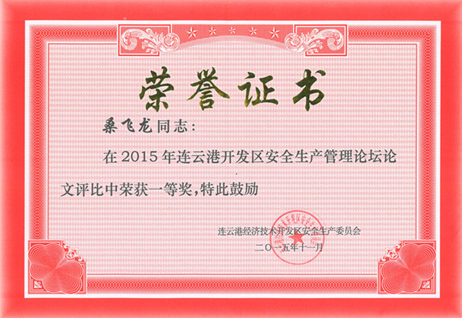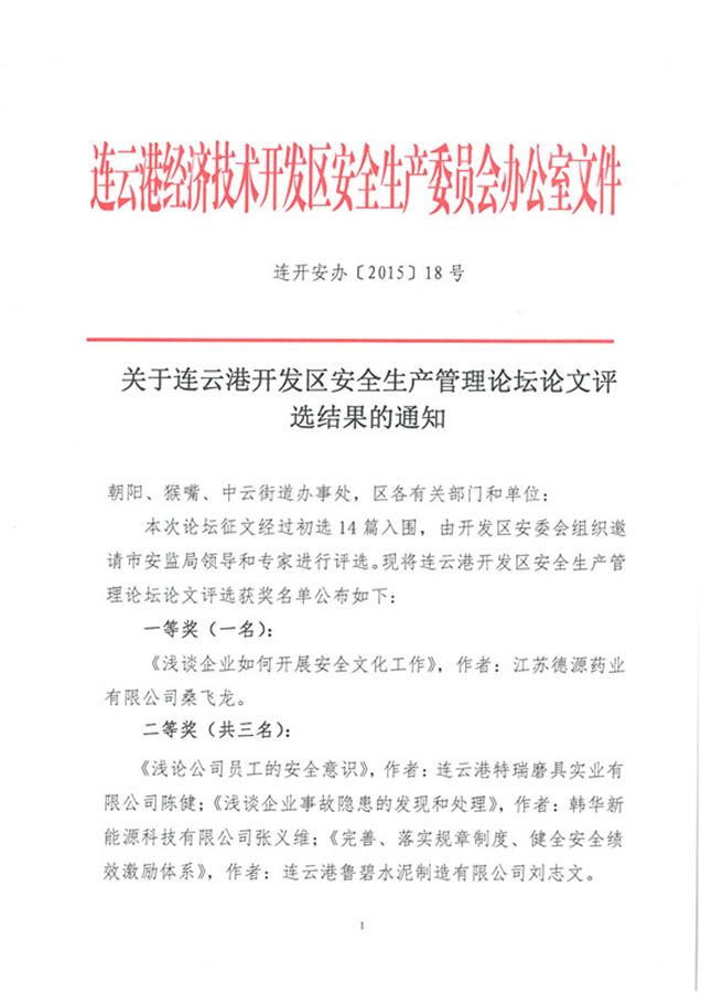 長(zhǎng)期以來(lái),我公司始終秉承安全發(fā)展的原則,積極貫徹執(zhí)行“安全第一”的生產(chǎn)方針。今年,我公司以實(shí)施安全標(biāo)準(zhǔn)化工作為基本,將企業(yè)安全生產(chǎn)工作與企業(yè)文化工作相結(jié)合,著重提升員工的安全素養(yǎng),營(yíng)造一種全員參與的安全文化氛圍。日前,在第五屆“連云港經(jīng)濟(jì)技術(shù)開(kāi)發(fā)區(qū)安全生產(chǎn)管理論壇”論文評(píng)比中,我公司桑飛龍同志撰寫(xiě)的《淺談企業(yè)如何開(kāi)展安全文化工作》一文,獲得一等獎(jiǎng)。