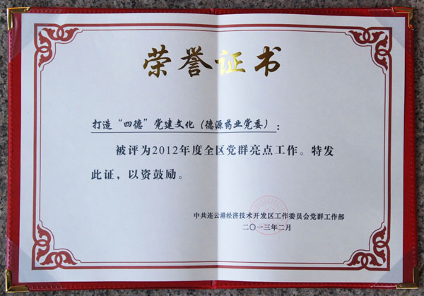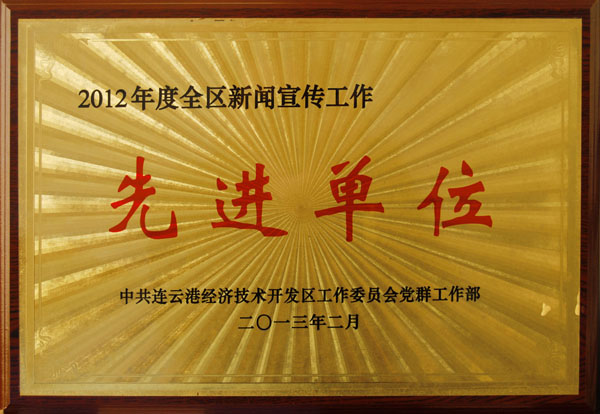 2月23日,連云港經(jīng)濟(jì)技術(shù)開發(fā)區(qū)黨工委召開黨建暨群團(tuán)工作會議。會上,我公司以“德”為核心的“四德”黨建文化被開發(fā)區(qū)黨群工作部評為2012年度全區(qū)黨群亮點工作。