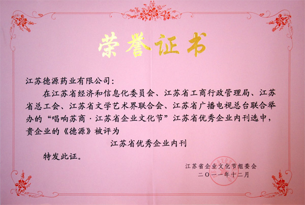在省經(jīng)信委、省工商局、省總工會、省文聯(lián)、省廣報電視總臺聯(lián)合開展的“江蘇省企業(yè)文化節(jié)”優(yōu)秀企業(yè)報刊評選活動中,《德源》內(nèi)刊經(jīng)資格審查、專家初評、媒體公示、網(wǎng)絡(luò)投票、評審團(tuán)終審,從80多家企業(yè)內(nèi)刊評比中脫穎而出,被評為“江蘇省優(yōu)秀企業(yè)內(nèi)刊”。