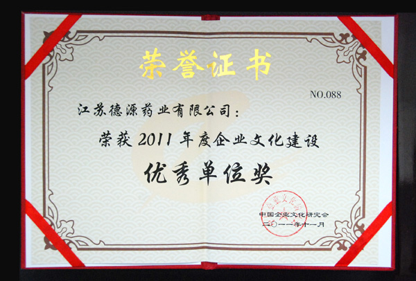 在剛結(jié)束的由中國(guó)企業(yè)文化研究會(huì)主辦的“企業(yè)文化30年:實(shí)踐路徑與方式—中外企業(yè)文化2011北京峰會(huì)”上,江蘇德源藥業(yè)有限公司喜獲全國(guó)“企業(yè)文化建設(shè)優(yōu)秀單位”榮譽(yù)稱號(hào),這也是今年全省醫(yī)藥行業(yè)唯一獲此殊榮的單位。